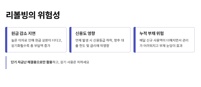 리볼빙을 장기간 이용하면 이자 부담으로 인해 원금이 좀처럼 줄어들지 않는 문제가 발생할 수 있습니다. 따라서 단기적인 자금 부족 해결에는 도움이 되지만 지속적으로 사용하기에는 적합하지 않습니다.